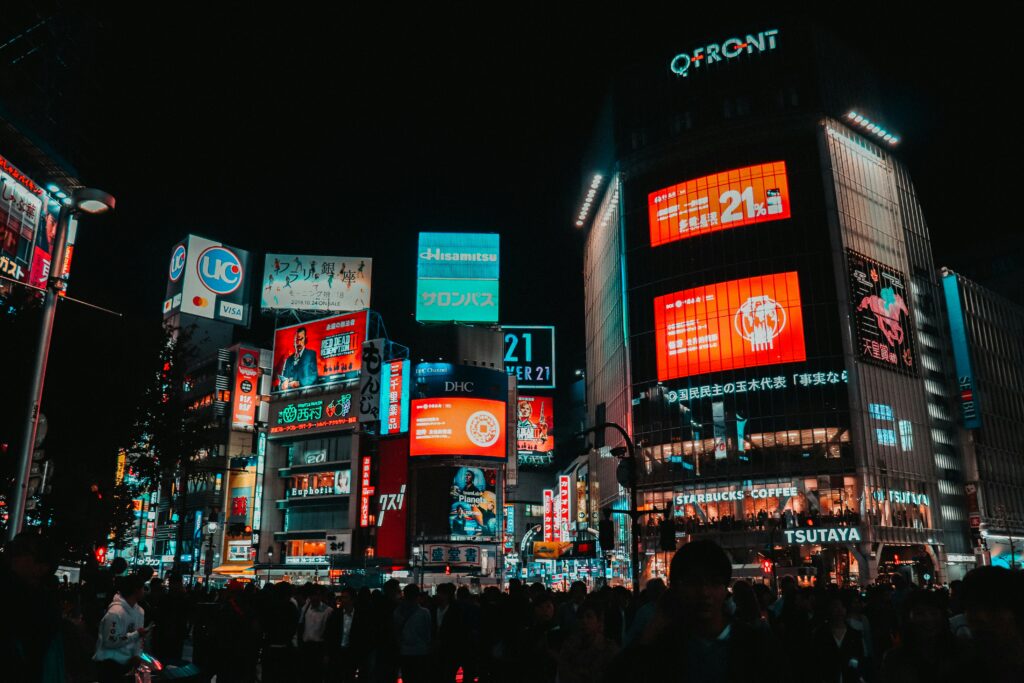 スクランブル交差点は沢山の人が往来してて、街は光り輝いて常にお祭りが行われているかのような光景が広がっている。