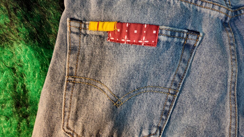 このデニムの憎いところは、見えない箇所にまでこだわっているところで、なんと人からは完全に見えないところである、ポケットの当て布部分に、ANDYの文字と、ジェシーとウッディが描かれている。