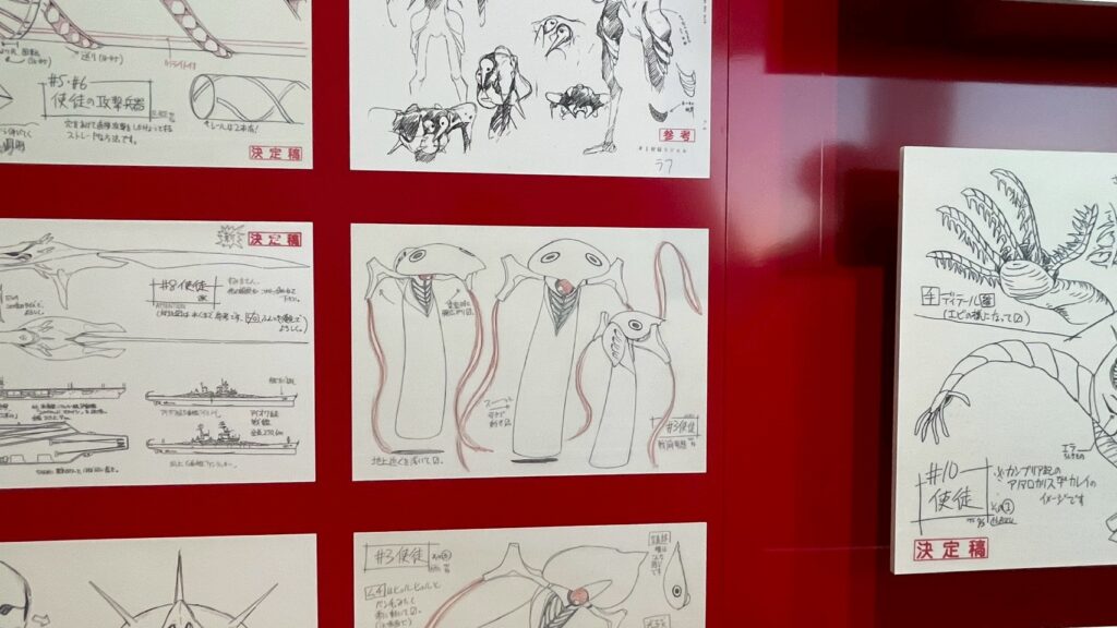ALL OF EVANGELION展では使徒や建物、キャラクターの素案となるデッサンやイラストが展示されている。